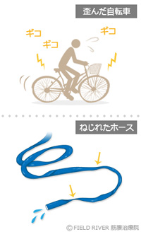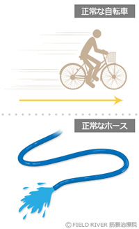「筋膜マッサージ®」で、筋膜の癒着・縮み・緊張を取り除いてあげると、軽くペダルを漕ぐだけでスーっと進む自転車のように、ねじれの取れたホースが元に戻って水がスーっと流れるように、筋肉・骨・内臓・関節・血液・神経などの働きは改善され、スムーズに機能するようになっていきます。