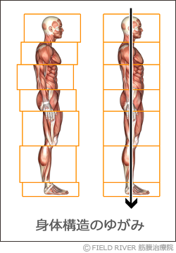 筋膜に癒着・縮み・緊張が生じると、身体は歪み、傾いた状態で重力とのバランスをとらなければなりません。